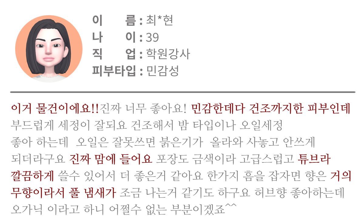| 식품의약품안전청 심사 필 유무 | 일반화장품 | 사용시주의사항 | 1.화장품을 사용하여 다음과 같은 이상이 있는 경우에는 사용을 중지하여야 하며, 계속 사용하면 증상이 악화되므로 피부과 전문의 등에게 상담할 것. 가) 사용 중 붉은 반점,부어오름, 가려움증, 자극 등의 이상이 있는 경우. 나) 적용 부위가 직사광선에 의하여 위와 같은 이상이 있는 경우 2. 상처가 있는 부위, 습진 및 피부염 등의 이상이 있는 부위에는사용을 하지 말 것. 3. 보관 및 취급 시의 주의사항. 가) 사용 후에는 반드시 마개를 닫아둘 것. 나) 유아ㆍ소아의 손 이 닿지 않는 곳 에 보관할 것. 다) 고온 또는 저온의 장소 및 직사광선이 닿는 곳에는 보관하지 말 것. 4. 눈 주위를 피하여 사용할 것. |